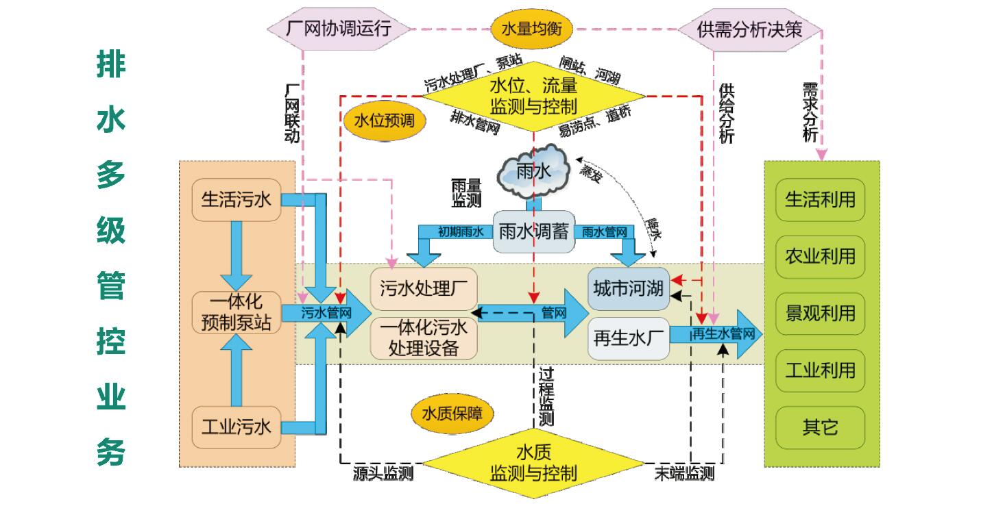 排水多級管控業務是將污水處理廠、排水管網、城市河湖按照“統籌建設、協調運行”理念,對水務基礎設施進行全要素管理,進一步提高全域水環境綜合管理水平。