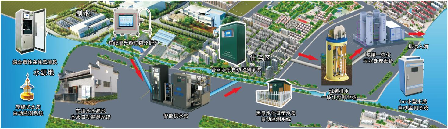 • 從城市的水廠源頭至小區終端的二次加壓、在線的水質處理及檢測,保證小區的飲水健康。同時將供水、水質、用水量及安防等主要信息上傳至智慧水務平臺,由平臺統一管理,對有供水需求的片區合理分配,需要多少供多少形成供水分區。城市的排水管網復雜多樣,排水管道多為重力管道、污水或雨水管道到低洼處就需要城鎮排水一體化預制泵站將污水或雨水進行提升。在水環境治理的大背景下,偏遠及農村地區遠離污水處理廠,管網建設成本巨大,通過城鎮一體化污水處理設備將污水直接處理效果能達到“一級A”標準便可以直接排到至河道。同時配套河道極速處理一體化設備通過二級生物處理技術及深度處理技術達到河道治理的效果。水環境一體化綜合解決方案使城市水環境建設應形成完整的水環境體系,并使水環境之間,水環境與外部水系之間相互聯系,相互貫通,從而形成流動的水,富有靈氣的城市水環境。