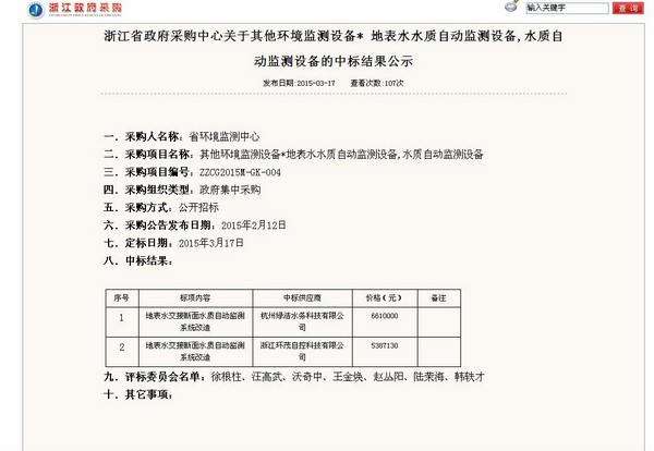 綠潔國際于2015年3月13日參加了由浙江省政府采購中心組織的關于省環境監測中心其他環境監測設備*地表水水質自動監測設備,水質自動監測設備的公開招標,綠潔國際憑借領先的理念與先進的技術贏得專家組青睞,最終以絕對優勢以661萬元的價格獲得標的,中標信息已于浙江省政府采購網站上公示。
