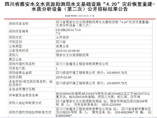 綠潔國(guó)際再傳喜訊,四川綠潔成功中標(biāo)四川省雅安水文水資源勘測(cè)局水文基礎(chǔ)設(shè)施“4.20”災(zāi)后恢復(fù)重建-水質(zhì)分析設(shè)備(第二次)項(xiàng)目,項(xiàng)目編號(hào):CZ-ZB(2014) 73-07-2,標(biāo)的1000多萬(wàn)元,中標(biāo)信息已于四川政府采購(gòu)網(wǎng)站上公示。