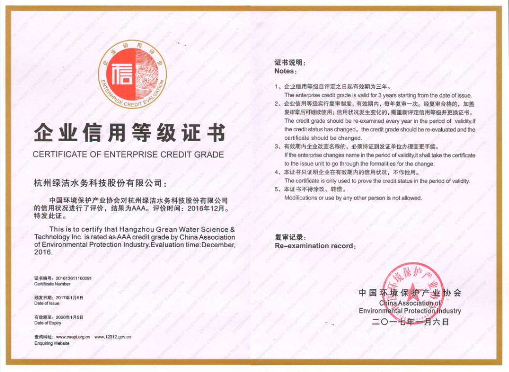 此項(xiàng)企業(yè)信用等級(jí)評(píng)價(jià),由國(guó)家商務(wù)部信用辦公室批準(zhǔn)、中國(guó)環(huán)境保護(hù)產(chǎn)業(yè)協(xié)會(huì)開(kāi)展,評(píng)價(jià)過(guò)程嚴(yán)謹(jǐn)、嚴(yán)格,評(píng)價(jià)結(jié)果經(jīng)公告后方可生效,有效期為三年,期間評(píng)委會(huì)每年會(huì)對(duì)企業(yè)進(jìn)行復(fù)審,以保證企業(yè)保持誠(chéng)信。