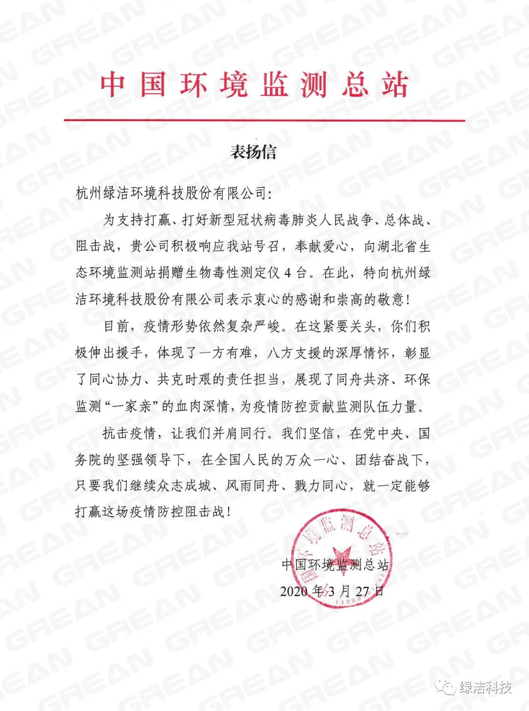 3月6日,綠潔科技通過中華環(huán)境保護(hù)基金會捐贈4臺便攜式綜合毒性檢測儀和136套水質(zhì)生物毒性快速檢測試劑盒馳援武漢,有效緩解了當(dāng)?shù)乜挂呶镔Y短缺的難題,這是自疫情爆發(fā)以來,綠潔科技抗疫的又一重要舉措。特此,中國環(huán)境監(jiān)測總站向綠潔科技發(fā)來表揚(yáng)信以表謝意。
