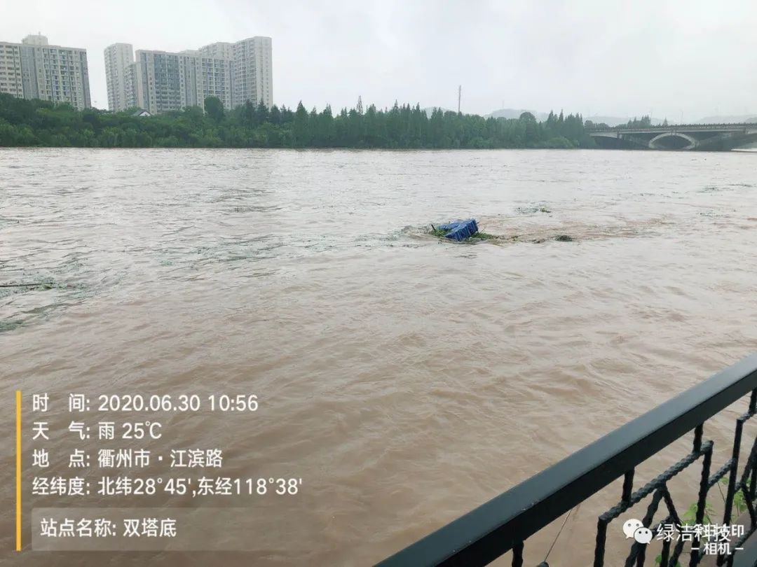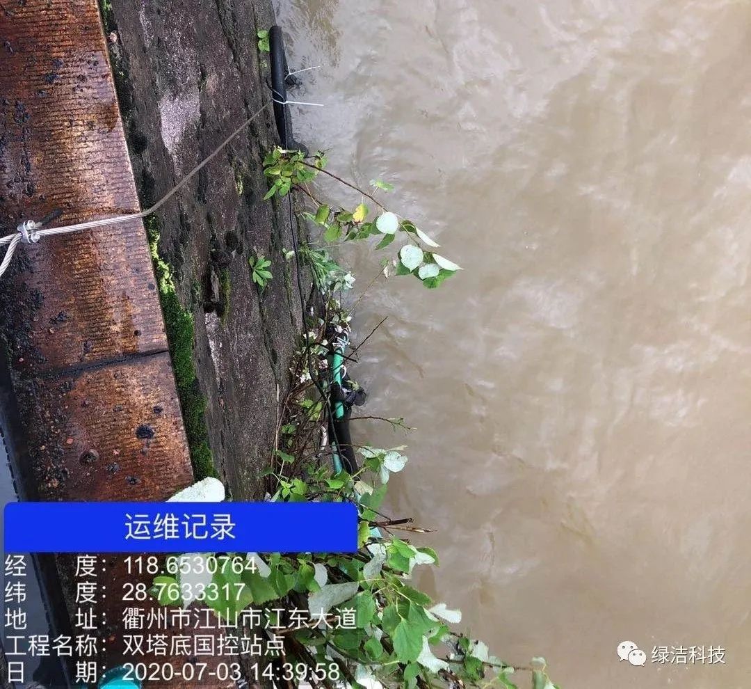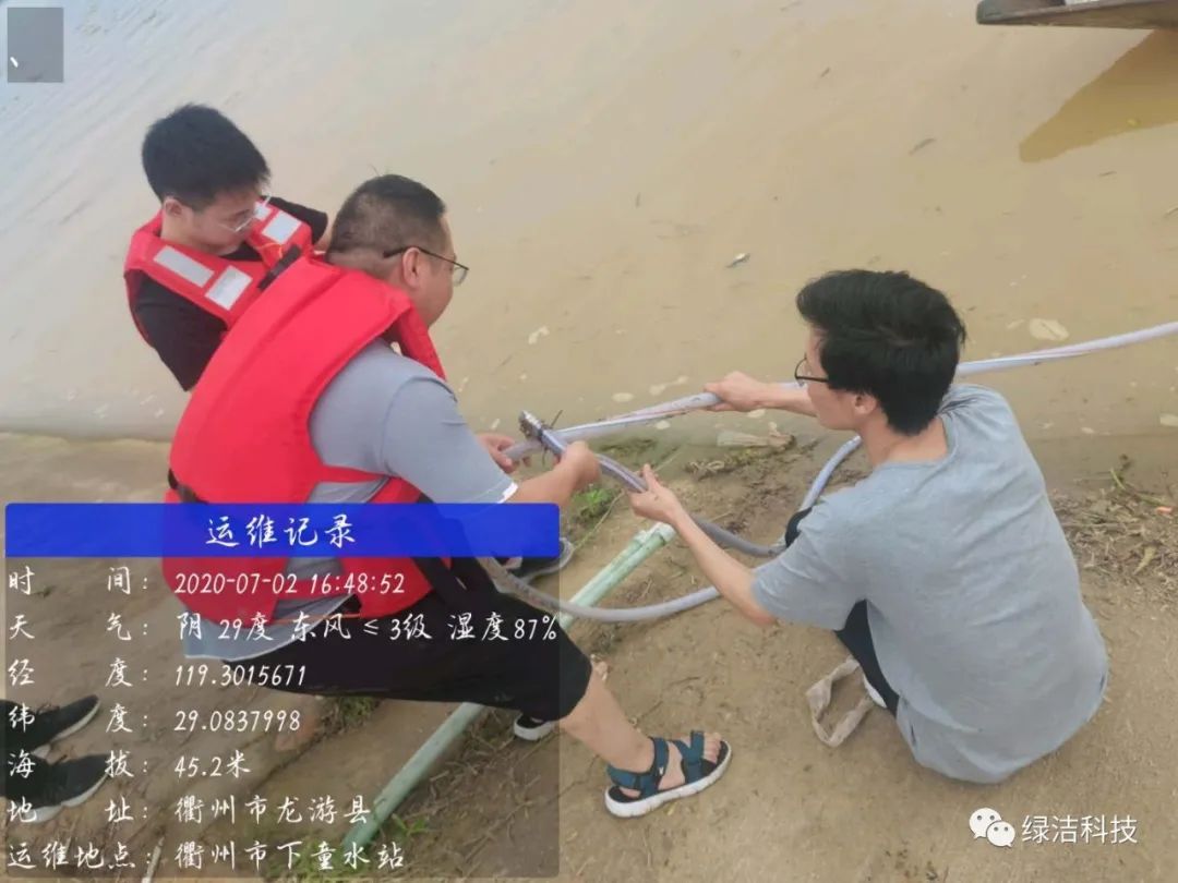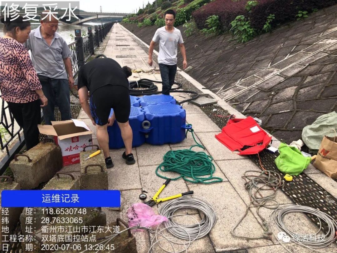6月30日因暴雨天氣,衢州市雙塔底國控站點采水設備被沖毀,導致水站無法正常運行。接到維修任務的8小時內,綠潔科技運維工程師與監測站人員等組成維修小隊趕赴現場查看,并提出臨時采水方案保障雙塔底國控站及時恢復正常運行。