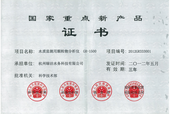 綠潔水務承擔的國家水專項課題研發成果“水質監測用顆粒物分析儀(GR-1500)”通過建設部科技發展促進中心的評估,獲得國家科學技術部、環境保護部、商務部和國家質量監督檢驗檢疫總局等四部委的一致認可,于今年被科技部正式授予“國家重點新產品”稱號,突出顯示了該產品所受到的高度關注和巨大的應用價值。